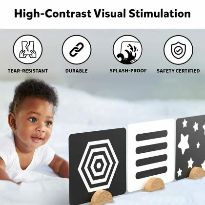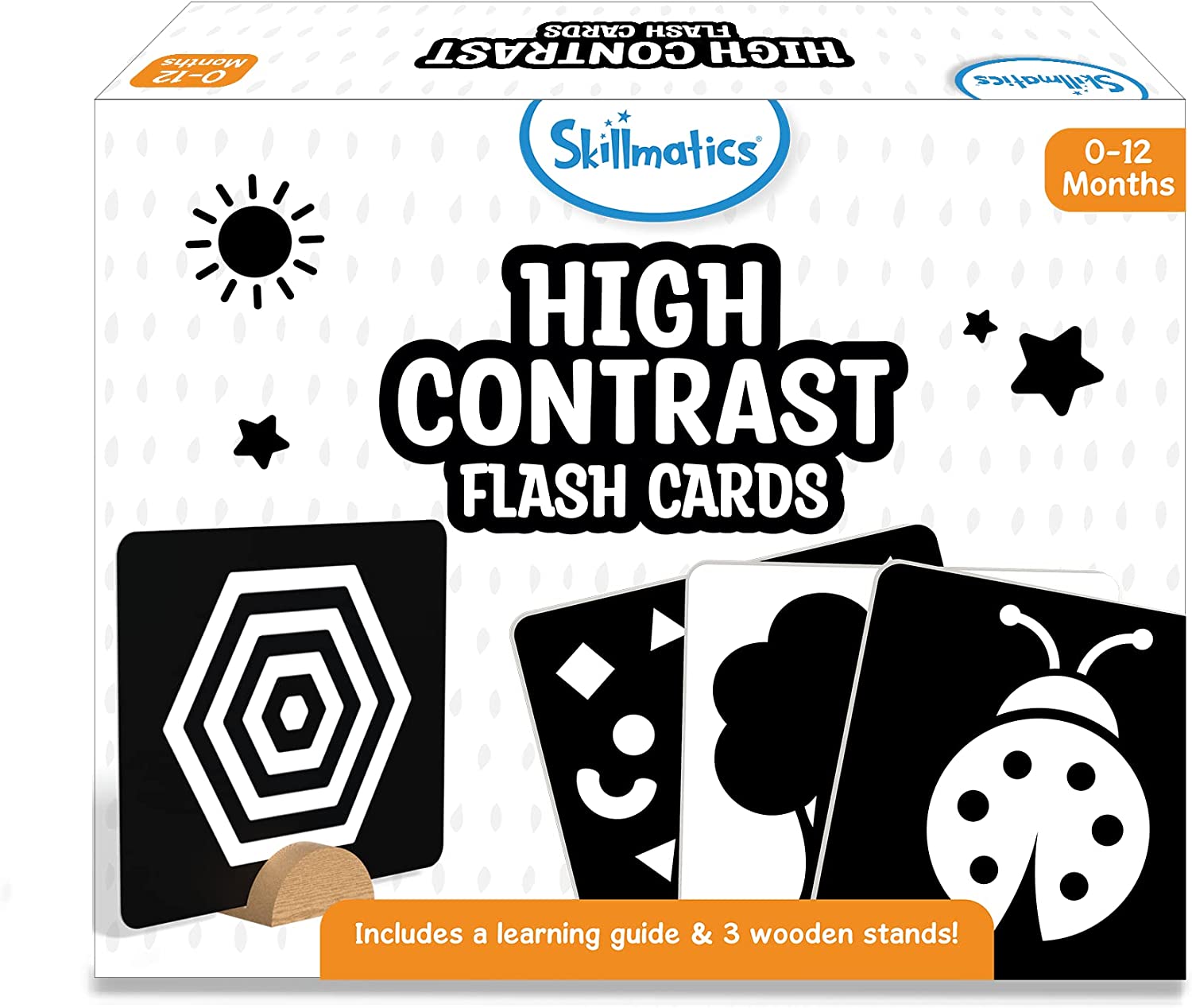 Skillmatics High Contrast Flash Cards were designed by educators as a learning tool for babies 0-12 months. The black and white high-contrast images range from simple shapes to more complex patterns and objects to stimulate baby’s developing brain and vision in their first year. Prop cards up in the wooden stands for stimulating tummy time. The cards are durable and non-bendable. Great for early object recognition and vocabulary. Also great for individuals with limited vision.