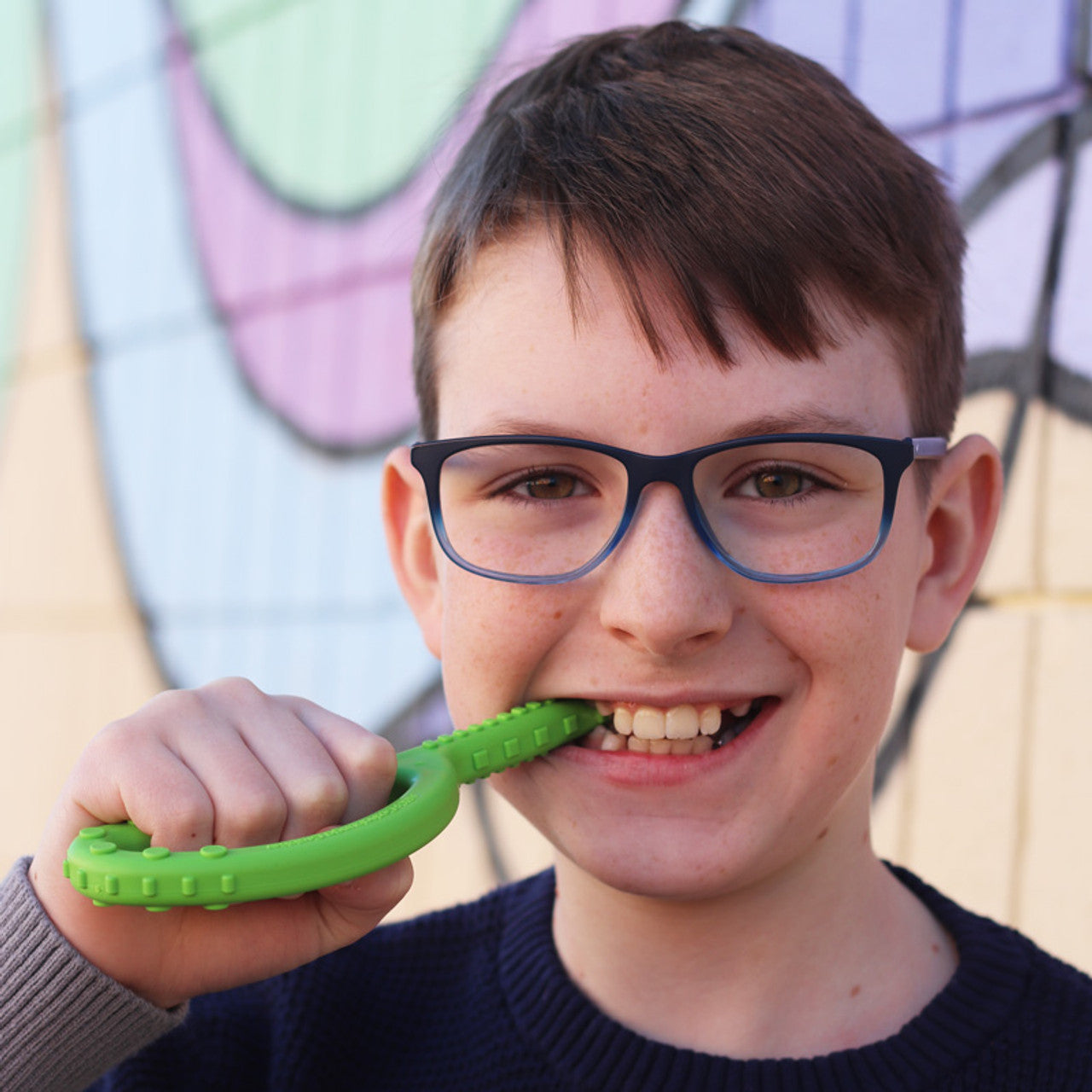 Use it as a safe alternative to chewing on one's hands, shirts, pencils, etc. It can also be used as an oral motor therapy tool to practice biting/chewing skills without the risk of choking, build jaw strength and stability, and exercise the mouth muscles.