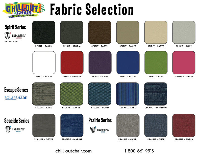 - A wide variety of wipeable, machine washable fabrics and color options are available to satisfy sensory needs or to compliment home, school or clinic decor.