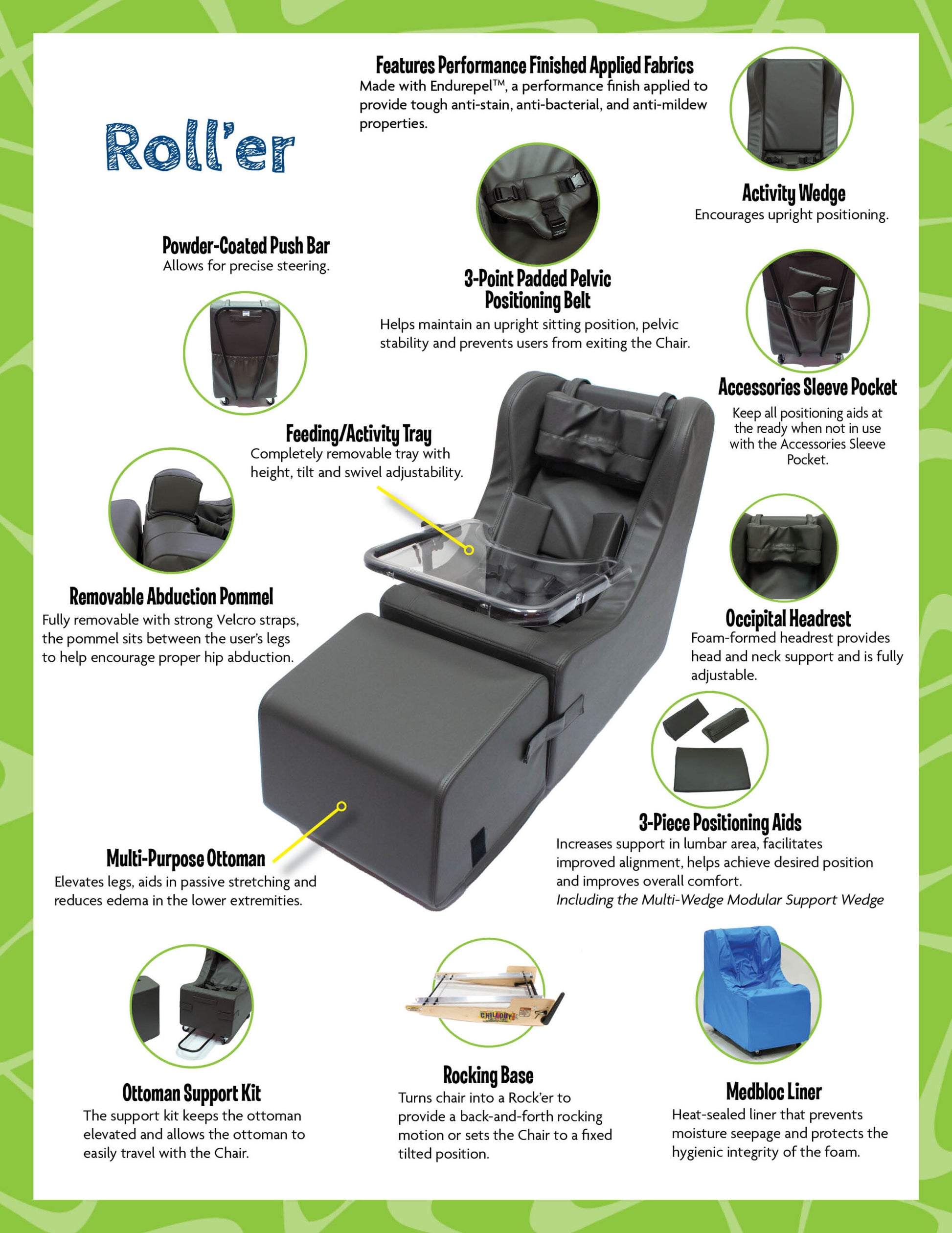 - Multiple accessory options to further customize the adaptive chair to the user’s needs.