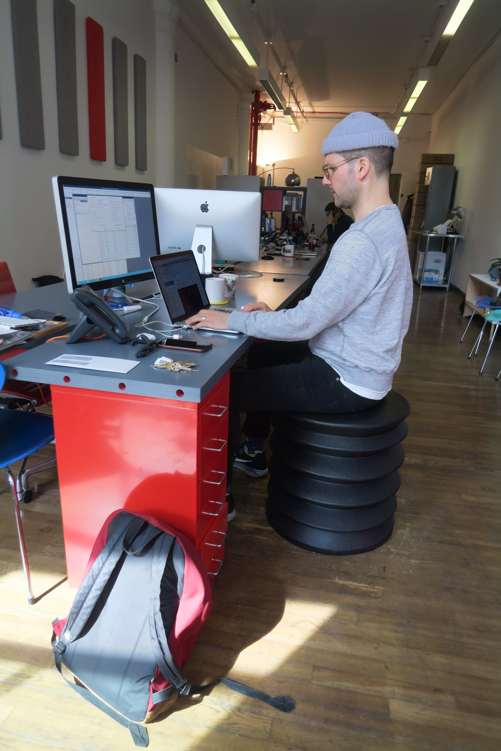 ExtraErgo offers all the benefits of ErgoErgo. Your body is free to move, your core is engaged. With its larger seat, Extra Ergo provides more comfort for taller, larger people, and more stability for every body. ErgoErgo compresses slightly when you sit on it to the height of a standard chair, which makes it perfect for a standard desk height. Suitable for people 5’ to 6’4”/152 to 193 cm tall. Weight load up to 250 pounds/114 kgs.