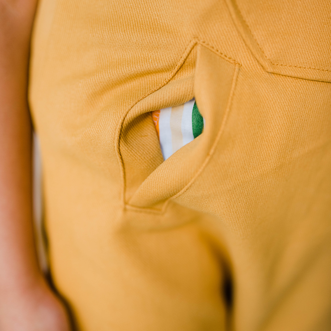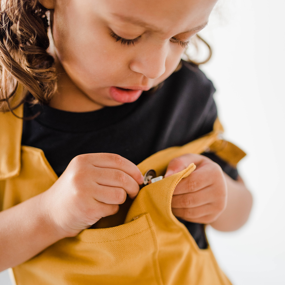 These adaptive overalls were designed to help those starting to work on independence in dressing. The straps are adjustable but magnetized so your young one can buckle them themselves. The straps also allow for easy pulling up. The back is slightly lowered to accommodate any diapering needs. It also features two welt pockets that are feeding tube accessible.