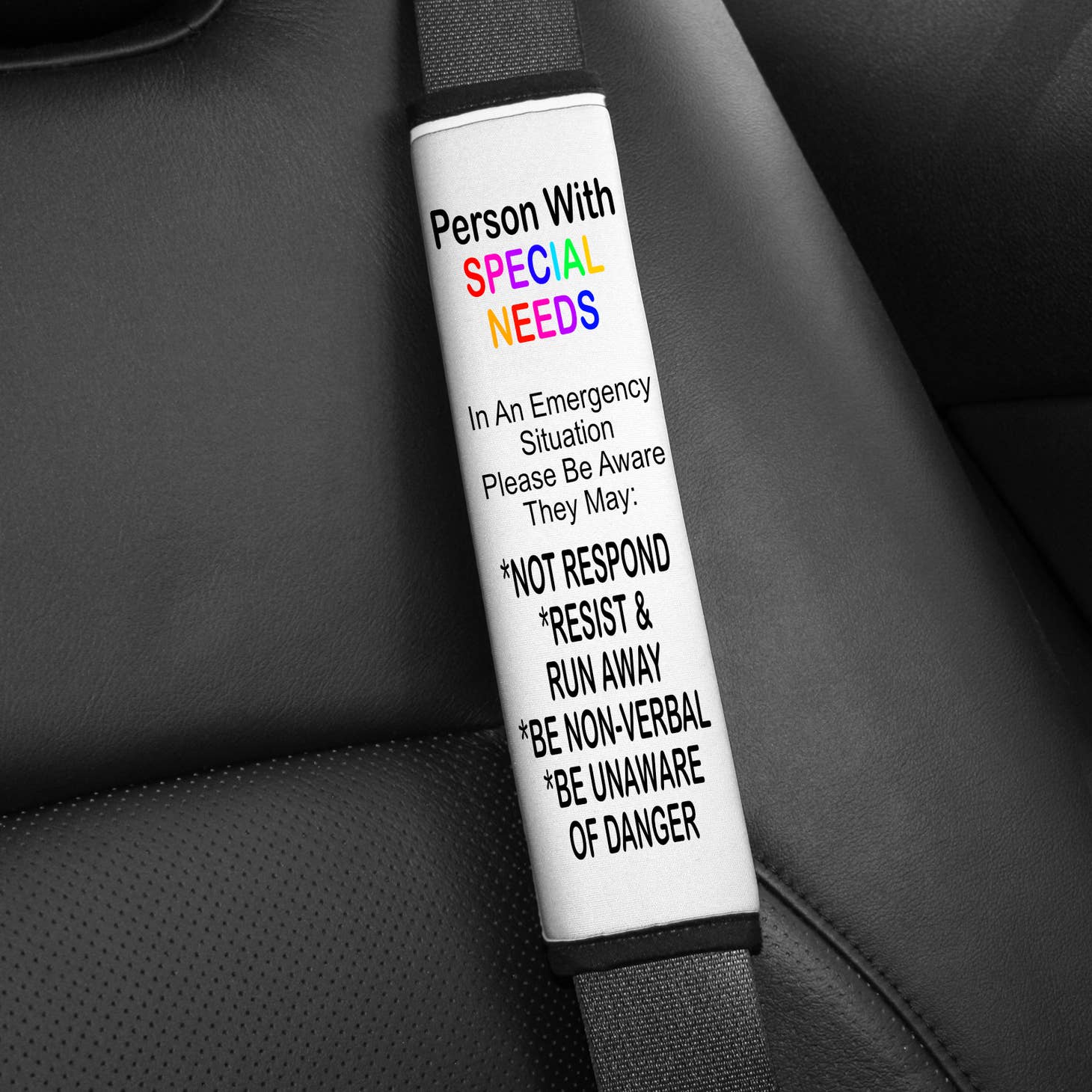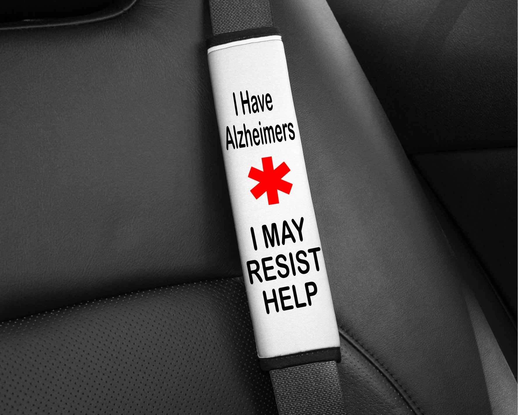 This seatbelt cover is used on most standard vehicle seatbelts to notify emergency personnel that the person in the seatbelt has a medical condition and may or may not respond to verbal communication. Made of polyester Permeant ink Velcro closure This attaches easily over existing seatbelts or strap of book bag.