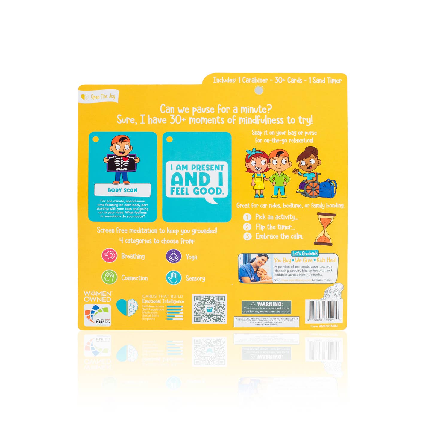 60 seconds is all it takes to settle big emotions and pacify hectic moments with Open The Joy's Mindful Minute Cards. Each card teaches a simple calming activity such as yoga poses, rhythmic breathing and grounding exercises, each accompanied by an uplifting quote to keep kids feeling cool, calm and confident.