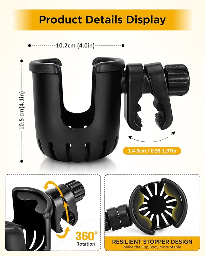 The diameter of our cup holder is 3.9 in, which is suitable for most cup, mug or water bottles.The clamps of our universal drinks holder can be adjusted to 4.5cm, and rotated 360 degrees, which makes our cup holder so compatible that it can be used most wheelchairs, walkers, and rollators.