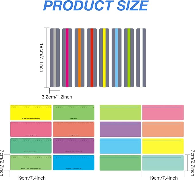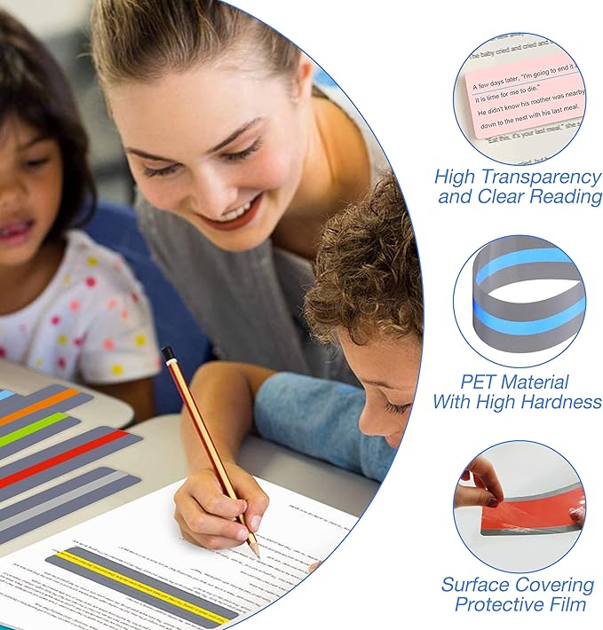 These reading strips make reading faster and more comfortable, and help with focus and concentration. Suitable for all ages and are a great tool for those with dyslexia. Includes 1 standard size, 1 large size with line, and 1 large size with tracking ruler. Waterproof and easy to clean!