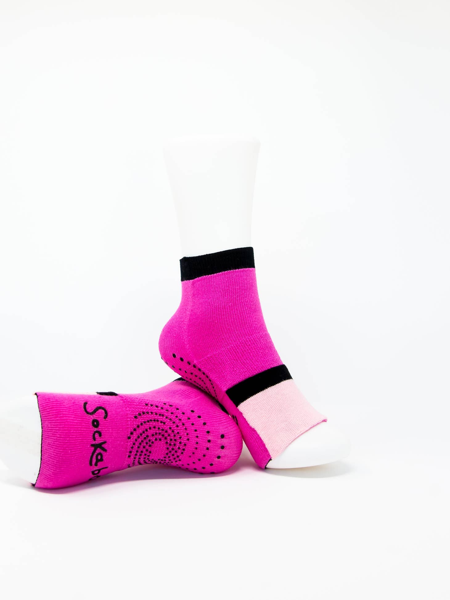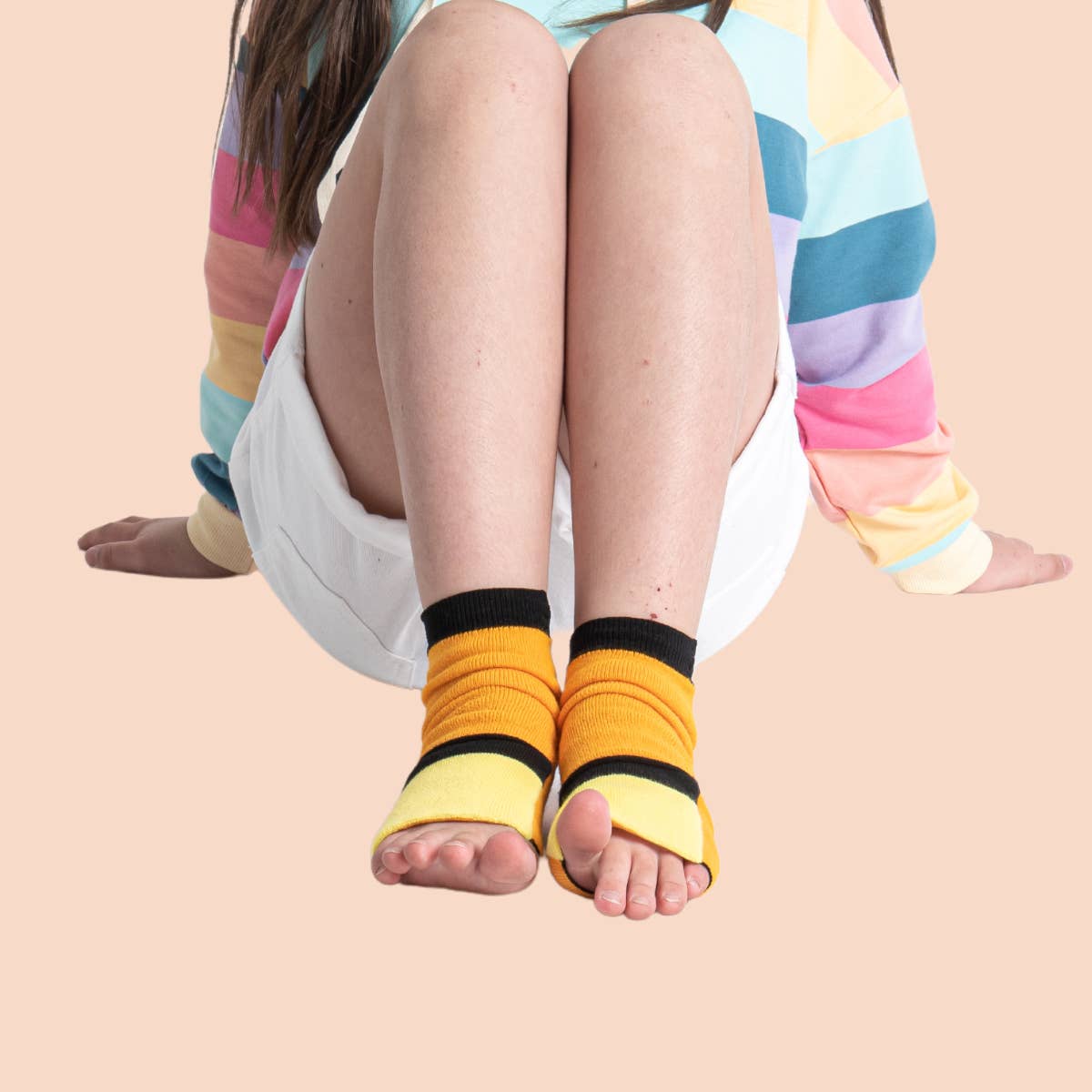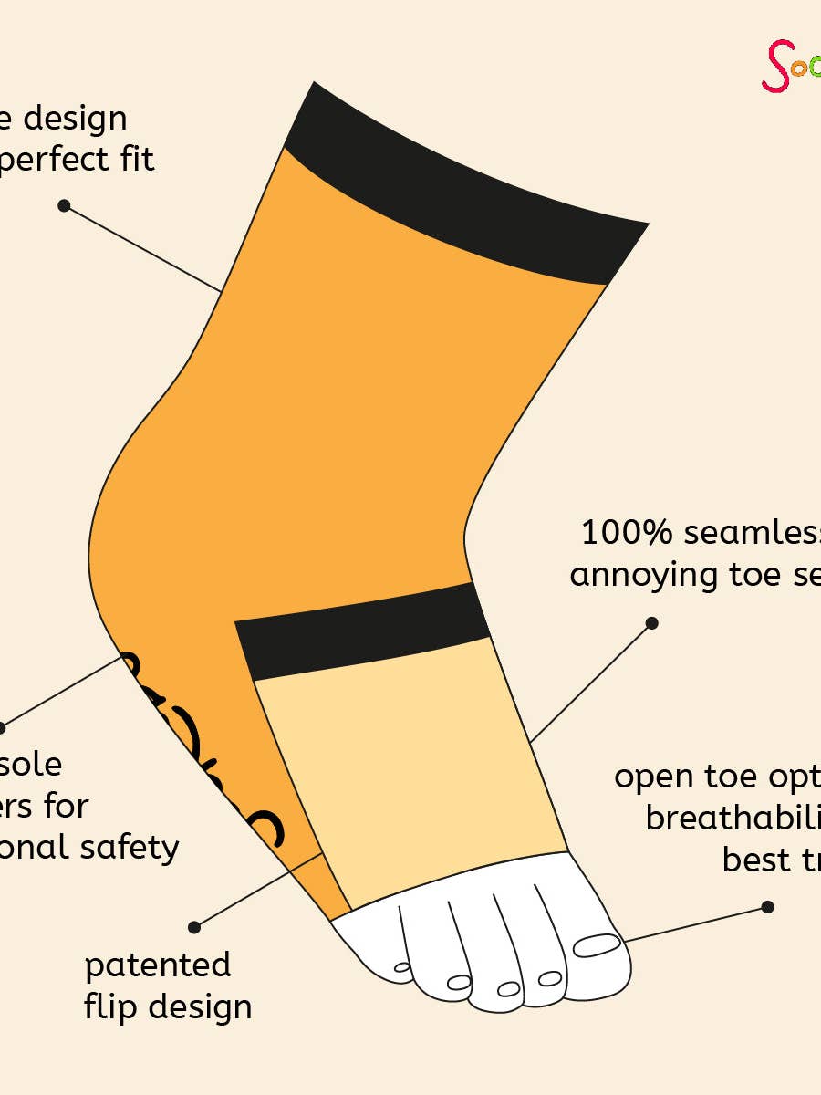 These socks are made with a 100% seamless construction; adaptive design. Sockabu socks are the only socks that allow you to cover your toes for coziness or uncover them for traction and breathability. Considered the "safer sock" by pediatricians. These sensory-friendly socks with the patented open toe design provide the best natural traction. The most breathable grip socks on the planet!